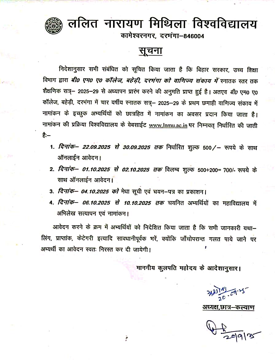 B.M.A. College, Baheri was established in 1970 as an affiliated college by the great philanthropist Late Bilat Mahtha of Darbhanga town for imparting co-education to the students of educationally backward rural area. By virtue of selfless and sacrificed efforts of some devotees mainly Late Thako Sahu, Late Ramavatar Mahto, Both from Baheri, Late Ram Chandra Singh of Bharwari (Baheri), Sri Tej Narayan Yadav (Katwasa) Baheri Ex Minister, Govt of Bihar and Late Rama Kant Jha ex Chairman, Bihar State Transport Corporation. This college passed its 11 yrs. Of eventful history. In the year 1981 govt. of Bihar as per its letter no. Edu. 126 dated 24.01.1981 directed the L.N. Mithila University to take over this college as its constituent unit. Accordingly the college was taken over by L.N. Mithila University on 02.05.1981. College is thankful to the then Chief Minister Dr. Jagannath Mishra for his personal attention towards higher education for poor and rural students particularly densely populated OBC category of this area. The college has upgraded its infrastructure and in spite of it being located in rural area, it tried to signify its name “ADARSH”. We, here, name the dignitaries such as Dr. Jagannath Mishra ex-Central Minister and Sri Ramvilash Paswan ex- Central Minister for their significant economic and moral support in this regard. The college is registered under 2(f) scheme of UGC vide UGC’s letter number F.no.8-53/82 (CP/MP) dated 30 April 1986 (Read More...)